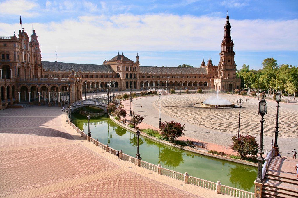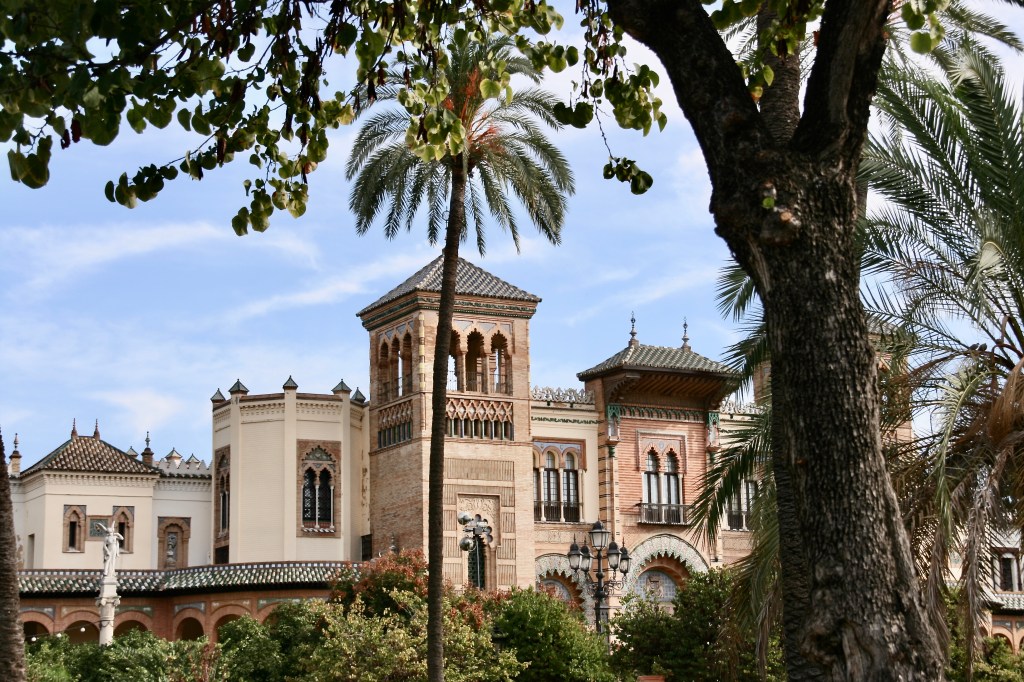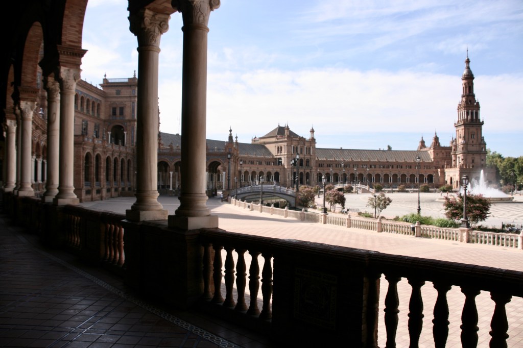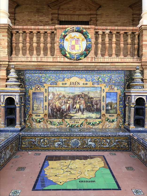 Después de un magnífico desayuno tomamos un Uber hasta la Plaza de América, en el Parque Maria Luisa (15 euros, puesto que por las limitaciones del Covid-19 tuvimos que tomar un coche más grande de lo habitual para poder entrar 4 personas, lo cual encareció el precio). La gente suele ir hasta la Plaza España, pero hay que llegar hasta más al fondo del parque para ver esta otra maravillosa Plaza de América así como esos otros pabellones que se hicieron para la Exposición Universal del año 1929. Son muchos los pabellones que se mantienen y además de muy variados son de una gran belleza. Por supuesto la guinda la pone la Plaza España. Espectacular en sus dimensiones, en sus formas y en sus pequeños detalles; además tuvimos la suerte de verla tranquila, sin gente. Qué bello el conjunto de bancos de cerámica dedicados a las provincias españolas donde es tradición hacerse la foto en el banco de tu ciudad, así que hicimos las fotos de honor en el de Castellón y Jaén.