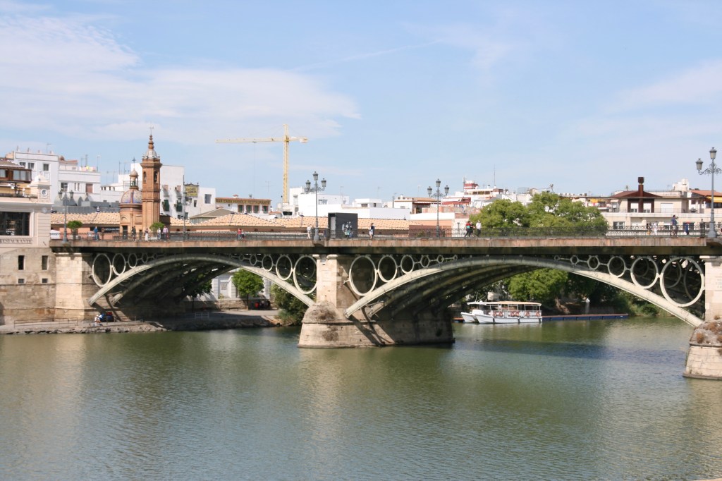 Tras esto nos dirigimos hacia la Torre del Oro y continuamos paralelos por el Guadalquivir para ver el Teatro de la Maestranza (no es uno de los edificios que más me agradó). Vimos la placa que recuerda uno de los lugares que aparece en ”Rinconete y Cortadillo” y nos adentramos para ver las Atarazanas Reales (están cerradas y en un estado de abandono), continuamos por la Plaza de Toros hasta llegar al bello Puente de Triana; atravesado éste nos metimos al Mercado de Triana y salimos ya al tan famoso y popular barrio. Dimos un paseo por la Calle Betis, desde la que se contemplan los edificios más emblemáticos de la ciudad, después fuimos por la Calle Alfarería y por la Calle San Jacinto además de alguna otra calle. En general es un paseo agradable, destacan las tiendas de alfarería, con una gran variedad de objetos a la venta, y los numerosos cuadros de azulejos con imágenes religiosas en las fachadas de algunos edificios. No obstante, desde nuestro papel como turistas no pudimos percibir más rasgos que hacen que este barrio sea tan especial. Pero, insisto, es un paseo agradable y no supone mucho tiempo.
