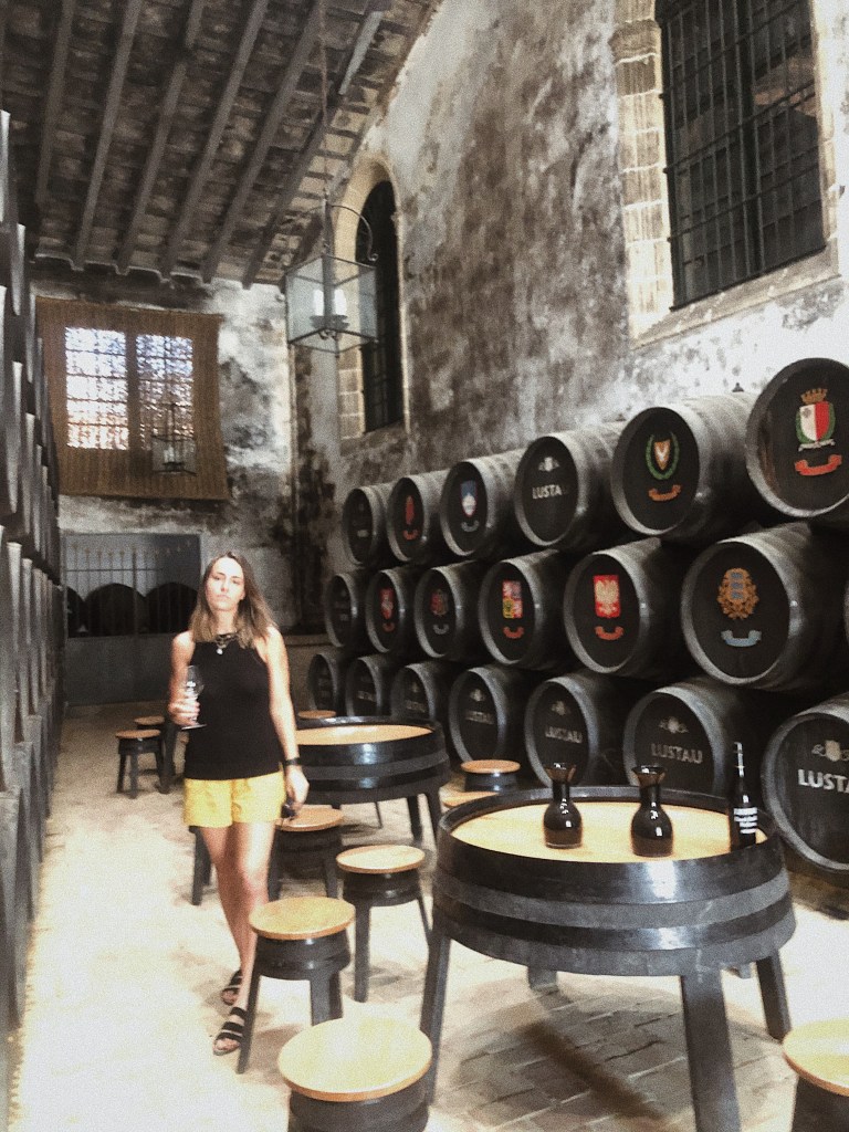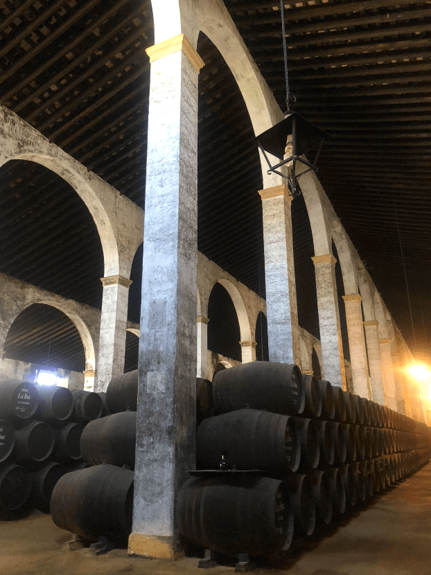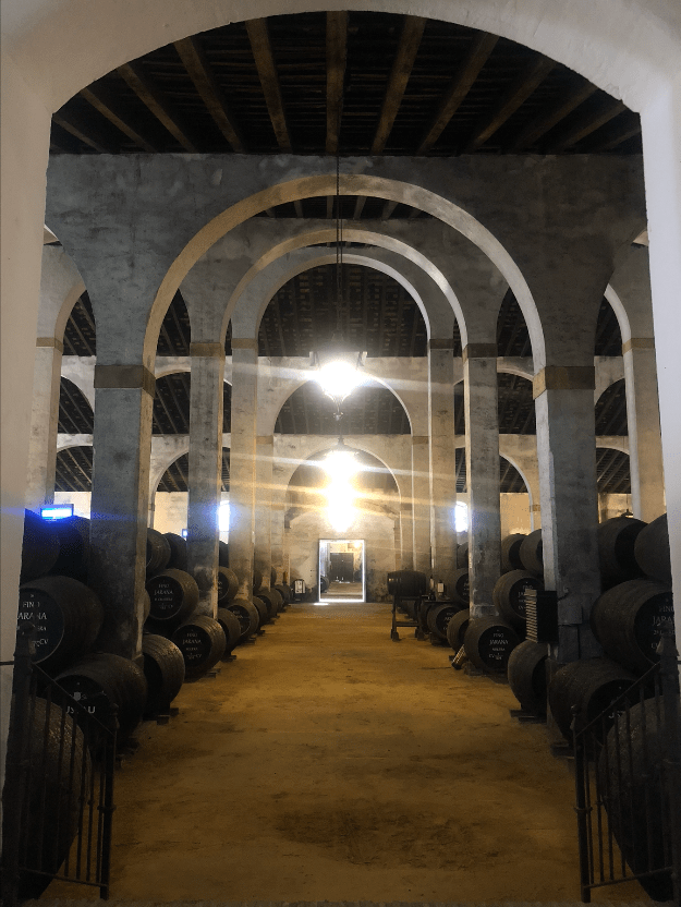 De camino a Cádiz se pasa por Jerez de la Frontera por lo que aprovechamos para visitar las Bodegas Lustao. Estas bodegas tienen más de un siglo de vida y en 1990 pasaron a la familia Caballero (recordáis el estribillo «Caballero, caballero, Ponche Caballero ) y que tiene una vinculación especial con mi familia. A las 11,30 empezamos la visita. Para la primera explicación ya te introducen en una de las naves en las que se guardan las botas, o barricas, impresionante las dimensiones de las naves. Auténticas catedrales del vino. Nos fueron pasando a diferentes naves y en cada una nos explicaron el proceso de creación de los tipos de vinos que se producen en esta importante zona vinícola. En concreto nos hablaron sobre los vinos amontillados, finos, palo cortados, olorosos, cream, vermuts. Por supuesto llevas tu copa y vas catándolos todos. Un mundo interesante y que forma parte de esta tierra.