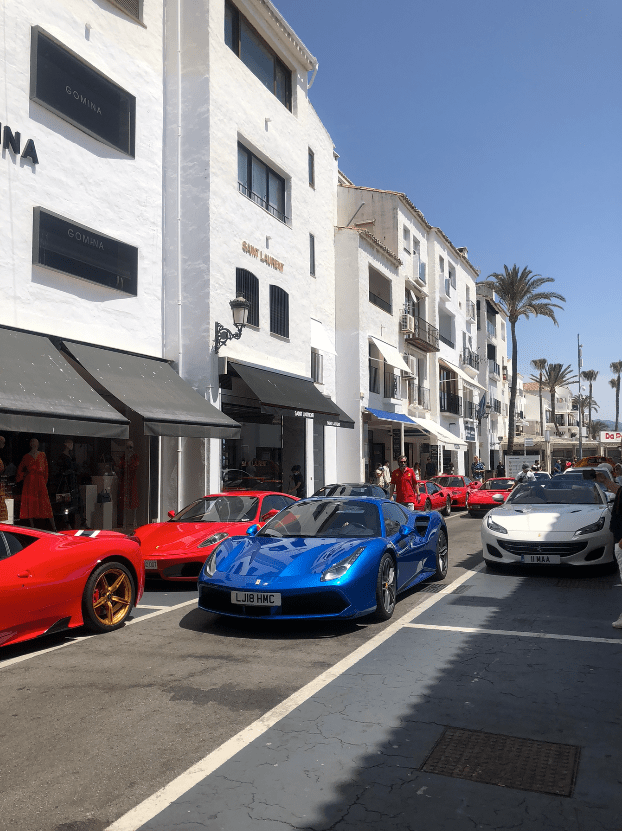 Paramos en Puerto Banús. Muchos yates, veleros y catamaranes para turistas además de tiendas con las mejores marcas del mundo (o quizá habría que decir las más caras). A la salida nos encontramos con una exhibición de cochazos; aproximadamente 50 coches que iban dando vueltas por el puerto. Predominaban los Ferrari, pero había de otras marcas como Mclaren, Maserati, Aston Martin…. Pero creo que el rasgo común a todos ellos es ser de los coches más caros del mundo.
