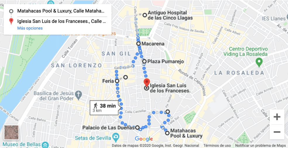 Al final de la calle Feria llegamos a la Basílica de la Macarena de estilo neobarroco donde están las imágenes de la Virgen de la Esperanza Macarena, Nuestro Padre Jesús de la Sentencia y Nuestra Señora del Rosario. En el exterior hay un conjunto formado por la Basílica, los restos del muro antiguo de la ciudad y el Antiguo Hospital de las Cinco Llagas, hoy Sede del Parlamento de Andalucía. En el interior de la Basílica hay bastante gente en un ambiente de gran solemnidad y respeto. Se palpa la emoción de la gente frente a las imágenes. La Hermandad de la Esperanza Macarena es de las más conocidas de la Semana Santa sevillana, hace estación de penitencia en la Madrugada del Viernes Santo.