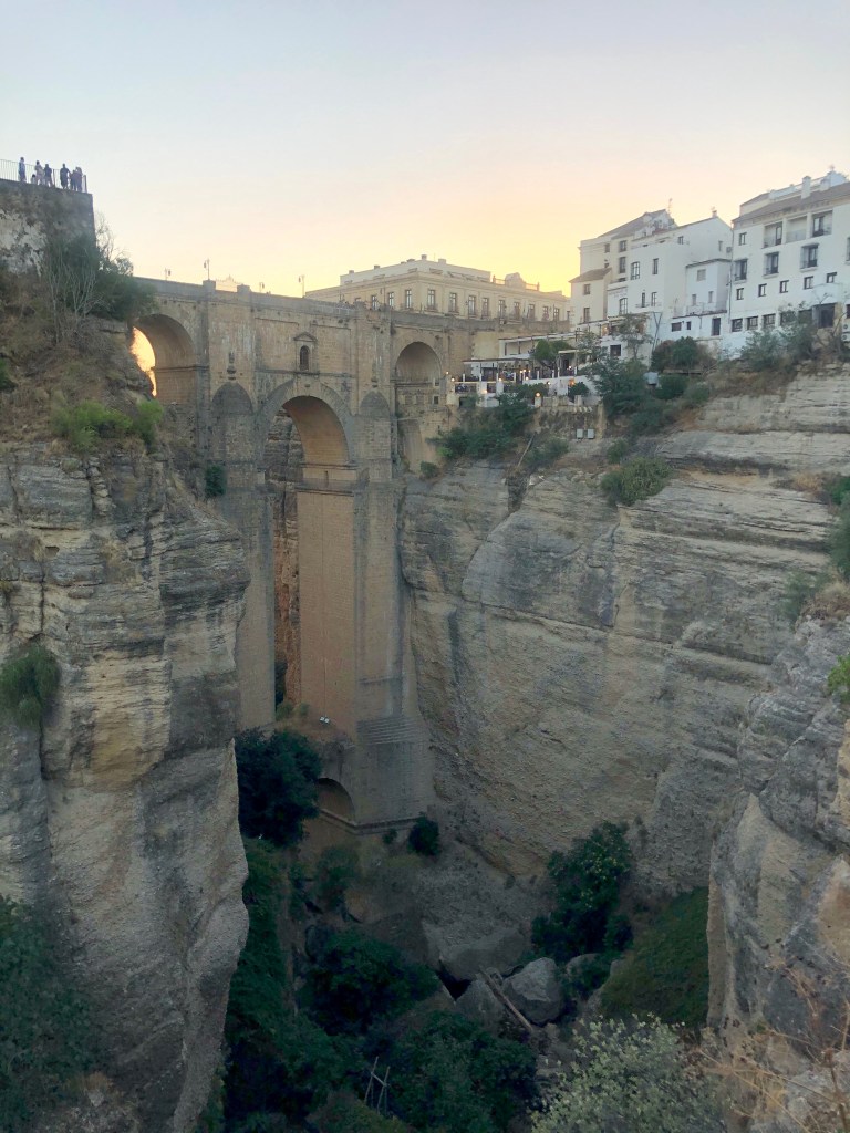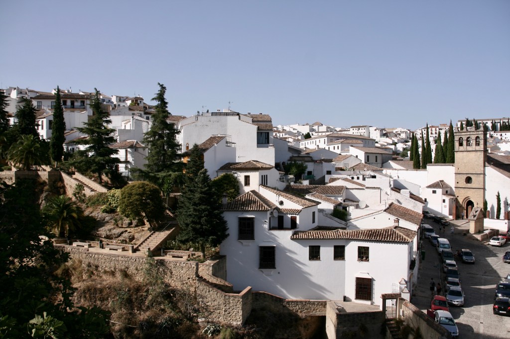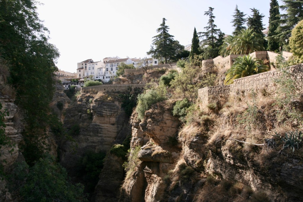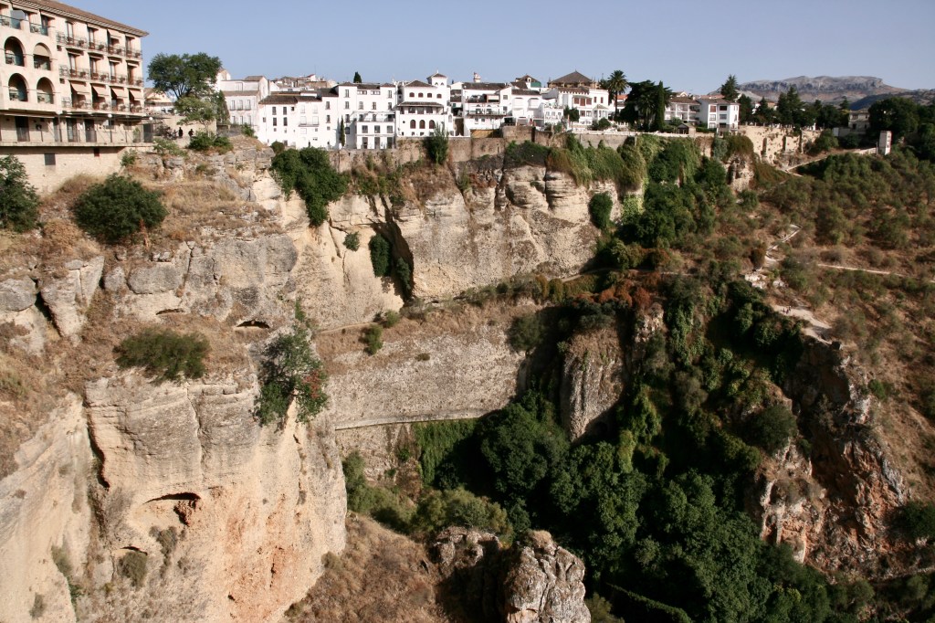 Una pequeña explicación. Hace millones de años se produjo el choque de las placas europea y africana. Emergió del mar el terreno en el que se asienta Ronda, junto a buena parte del sur de la península, con un relieve muy irregular. Luego el discreto y paciente río Guadalevín con su trabajo prolongado va abriendo una brecha cada vez más profunda. Llegan los humanos y se instalan en los bordes de este territorio elevado. Y deciden unir los bordes de la brecha del río por varios puentes… El caso es que la conjunción de la naturaleza y los humanos crea uno de los pueblos más impresionantes de la impresionante España. Ronda desparrama sus casonas, palacios e iglesias por esas cuestas creando estampas únicas.