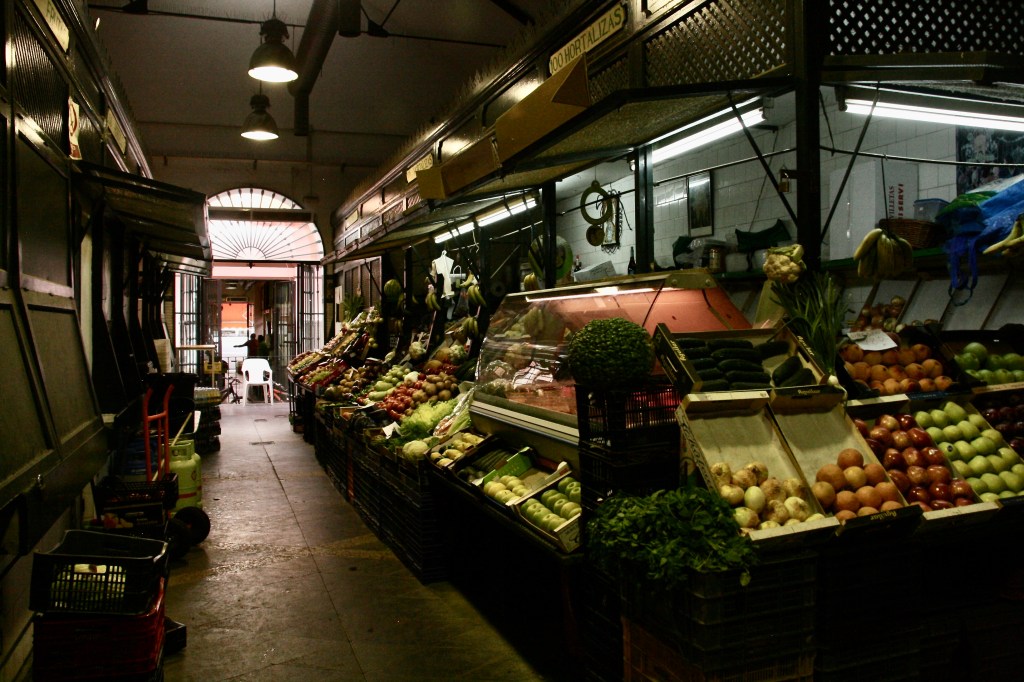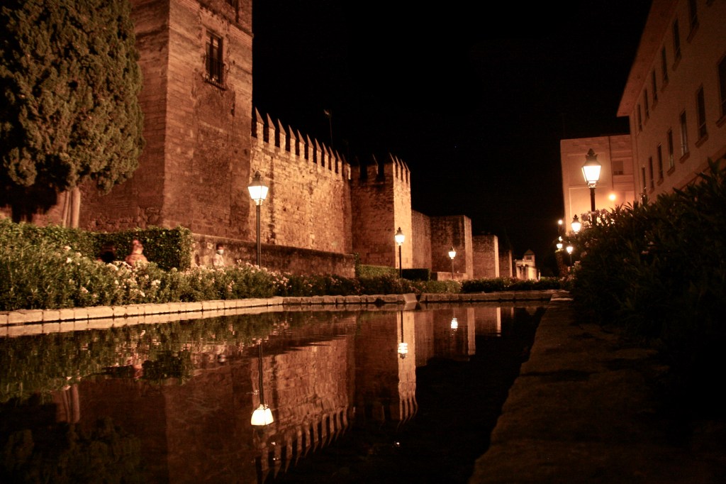 Después nos fuimos a la zona céntrica de Córdoba, la plaza de las Tendillas, gran y señorial plaza de inicios del s.XX y alrededores. Es la zona de mayor vitalidad de Córdoba, con calles peatonales llenas de tiendas, bares y restaurantes. Después de dedicarle un rato de “compras” nos fuimos al Mercado de la Victoria, situado en un alargado parque que queda al oeste del casco antiguo. Es una estructura de metal pequeña. Actualmente está llena de puestos con productos “gourmet” para consumir allí mismo, aunque también hay venta para llevar. El caso es que la estructura no se puede percibir, por fuera por los árboles y por dentro por los puestos que impiden una visión general. Además no tiene el típico ambiente de Mercado popular. Bueno… no supone mucho tiempo la visita y seguro que por las tardes tiene un ambiente de copeo. Al estar aquí aprovechamos para recorrer el parque hacia el sur. Hacia la mitad de esta superficie verde hay un punto maravilloso: por un lado está la Puerta de Almodóvar, por cuyo hueco se adivina la judería, se ve la Muralla con sus almenas acabadas en pirámides, una fuente que vierte su chorro en un alargado estanque, los cipreses… precioso lugar. Por la tarde-noche volvimos para verlo con la luz de la noche.