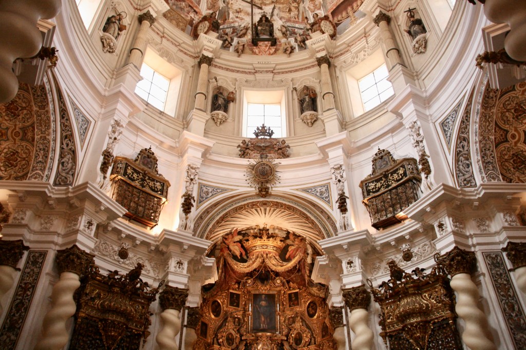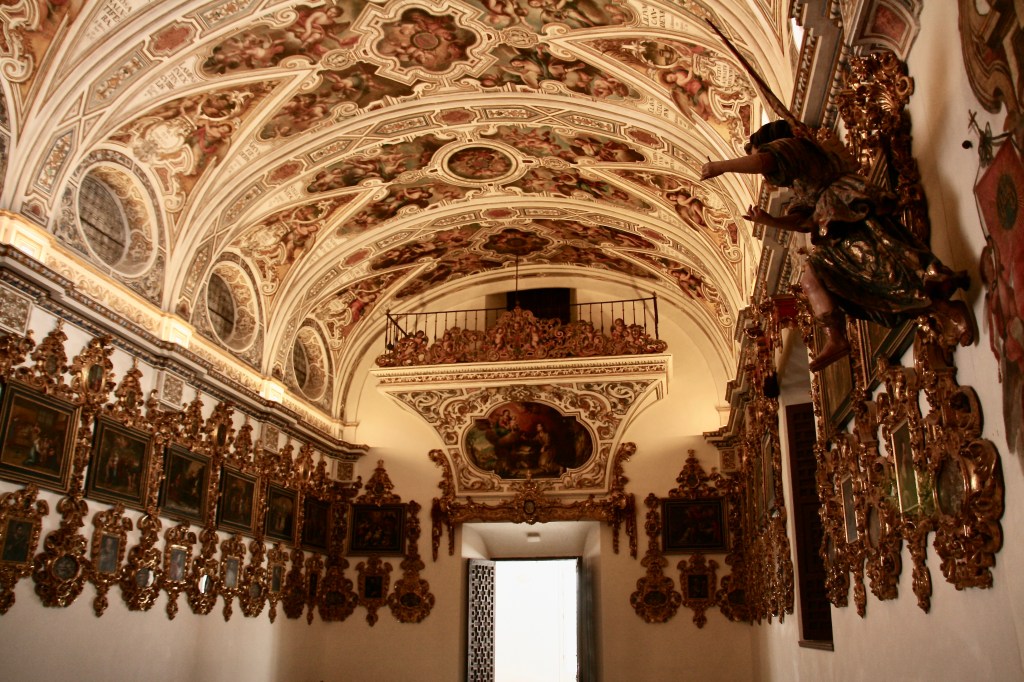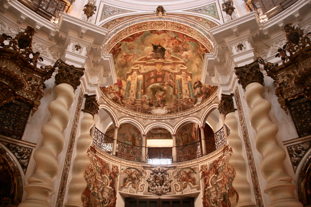 Más abajo está la Iglesia de San Luis de los Franceses, actualmente propiedad de la Junta de Andalucía. Hay que pagar una entrada de 4 euros que bien merecen la pena. La iglesia ocupa un espacio pequeño, pero para compensarlo construyeron hacia arriba y además con una decoración barroca del siglo XVIII espectacular. Además de la Iglesia se puede visitar la Capilla Doméstica (otra sala adjunta preciosa), la Cripta y un patio muy particular.