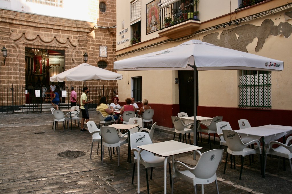 Para cenar nos fuimos al Barrio La Viña, un barrio muy popular en donde está la encantadora calle Virgen de la Palma, que está llena de terrazas y gente. Esta calle queda presidida desde un lado por la Iglesia que da nombre a la calle. Ahí probamos las tortitas de camarones.