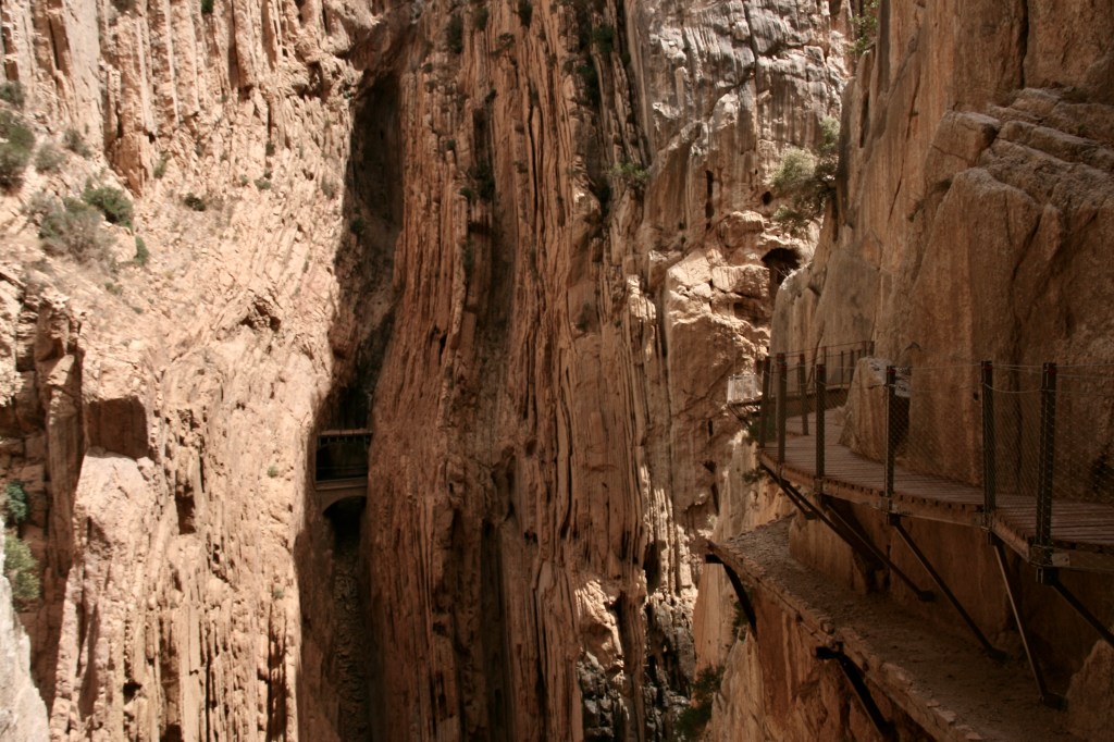 Independientemente de todo esto El Caminito del Rey es majestuoso. Es un paisaje que bien podría ser de Parque Nacional. Espacio muy amplio, con mucha vegetación y fauna. Unas rocas que se rompen y abren formando una garganta con una media de 100 metros de altura. Un río en ocasiones tranquilo en ocasiones muy alborotado que te va acompañando. Pero lo mejor es la perspectiva para ver este espacio natural. En pocos sitios puedes ir tocando la verticalidad de esas enormes paredes, sentir la grandeza de la naturaleza frente a tu pequeñez y debilidad. Realmente es un capricho humano el poder integrarte de esta manera en este paisaje. Además, y a pesar de la dificultad del espacio, las pasarelas dan una seguridad que casi vencen de forma plena las sensaciones de vértigo. El paisaje no es único, pero la forma de vivirlo Sí.