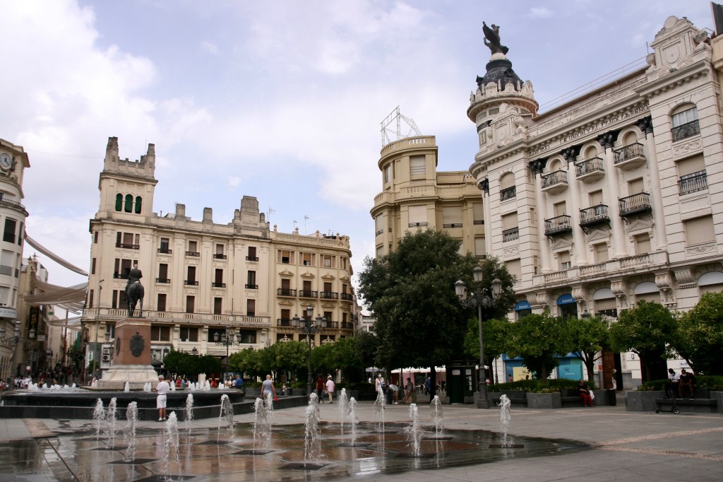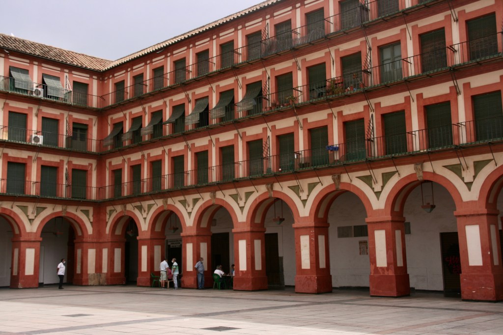 Tras visitar esta zona norte, nos dirigimos hacia el sur. Pasamos por plaza del Realejo, aquí ya entramos en una zona más comercial y con más vida, pero lleno de lugares muy bonitos y evocadores: plaza Poeta Juan Bernier, plaza San Rafael, plaza de la Magdalena… y llegamos a la plaza de la Corredera. Es una plaza muy curiosa en Andalucía. Recuerda las plazas mayores de Madrid o Salamanca. Es una gran plaza rectangular del S. XVII, casi toda ella uniforme salvo en la mitad de uno de los lados que mantuvieron dos edificios anteriores, de tal forma que casi todo el perímetro está ocupado por una construcción de cuatro alturas, un soportal corrido con arcos de medio punto y usando el blanco y el color teja como colores de la plaza. Aunque la plaza es bonita, me dio cierta sensación de dejadez y rompe mucho con el estilo característico de Córdoba. No obstante, esto también es Córdoba y por supuesto hay que verla.