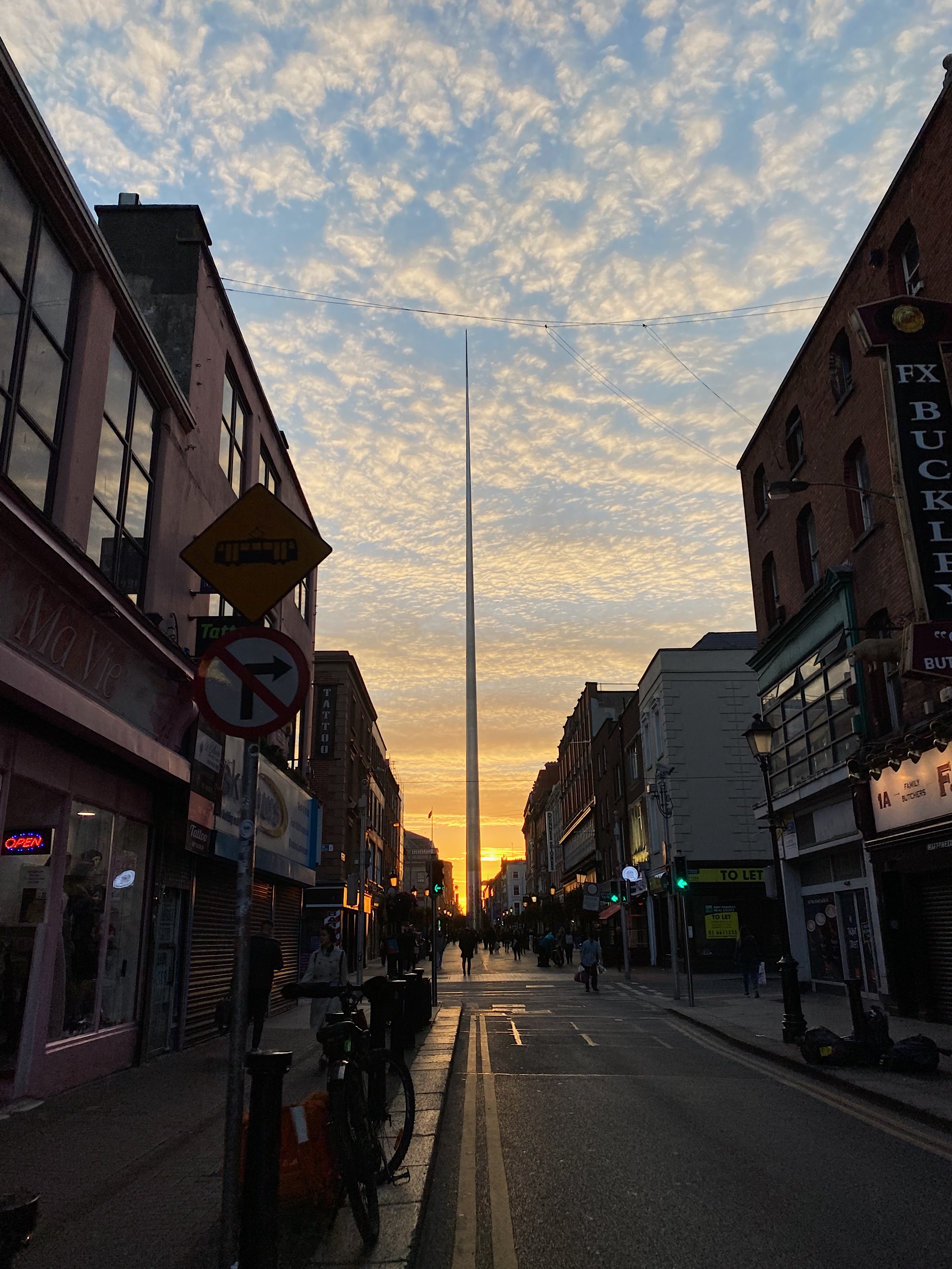 Empezaremos desde O’Connell Street que sería como la Gran Vía de Madrid, la arteria principal de la ciudad. Esta calle cuenta con 49 metros de ancho en su extremo sur, 46 en el norte y una longitud de 500 metros, que la hacen una de las calles más amplias de toda Europa. En el centro de la calle podemos encontrar el Spire, oficialmente denominado Monumento de la Luz y Pirulí por todos los españoles que vivimos allí. Es una escultura de acero inoxidable que mide 120 metros de altura y es una de las esculturas más altas del mundo.