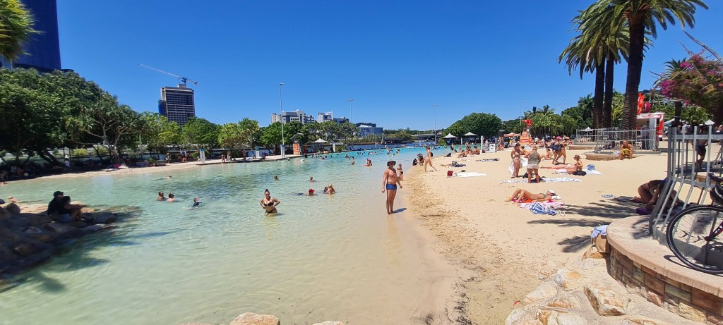 Empezando por el norte de South Bank lo primero que encuentras es la Galería de Arte Contemporáneo. Es gratis y el espacio es muy interesante, a mi personalmente me encantó. La valoración de  las obras expuestas  ya depende del gusto de cada cual. Inmediatamente después y hacia el sur aparece otro gran edificio en el que  está el Centro Cultural y otra Galería de Arte, también son gratis. Los edificios por fuera son grandes moles de hormigón pero muy bien ajardinados, con espacios muy bonitos y con muchas esculturas y fuentes. Además hay constantes vistas hacia el río. Merecen la pena. Si seguimos bajando paralelos al río nos encontramos con el típico letrero de letras gigantes con el nombre de la ciudad. Luego aparece una  gran noria.  Después una bella Pagoda Nepalesa. Un jardín tropical. Otro jardín japonés. Una maravillosa playa artificial de arena en la que te puedes bañar, también gratis.. Mobiliario urbano de diseño, bonito y con algunos elementos muy gozosos (camas elásticas para tumbarte con luces de colores y música relajante).