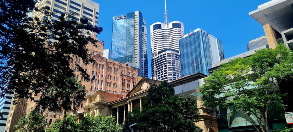 En esta ciudad el eje principal es el Brisbane River y además lo hace con majestuosidad y con mucha coquetería. El río se vuelve loco haciendo giros de manera que la parte turística queda en torno a un tramo del río que dibuja una V. Dentro de la V quedaría la parte de edificios históricos y las nuevas y más llamativas construcciones y en un lateral quedaría la parte lúdico-cultural.