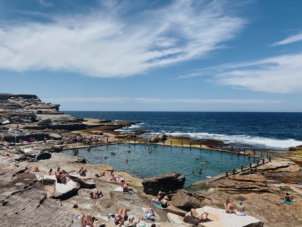 Aprovechamos el día para desplazarnos a Maroubra y conocer su piscina natural.  Los afloramientos rocosos y los acantilados que la coronan la convierten en un lugar espectacular. Tiene una longitud aproximada de 30 metros, con una forma rectangular y varios puntos de entrada. Con marea alta, las olas rompen espectacularmente en la orilla de la piscina. Con marea baja, la piscina está bastante tranquila.