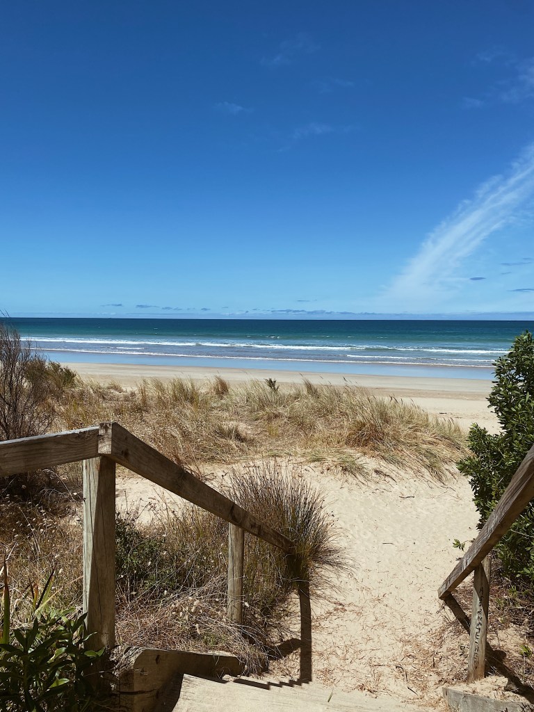 La última parada del día fue Apollo Bay. Pueblin que escogimos para hacer la primera noche y que es uno de los puntos más conocidos de la ruta ya que combina la ubicación costera con el ambiente bohemio de los lugareños. Cuenta con animados pubs, playas, tiendas de arte y artesanía y actividades de ocio. Nosotros llegamos ya bien entrada la tarde, así que una vez dejamos todas las cosas en nuestro alojamiento fuimos a dar una vuelta por la playa, y comprar comida para la cena y desayuno. Es una gran playa, pero nada excepcional para alguien que ha nacido en el mediterráneo español; lo que sí resulta especial es la fuerza de las olas y el color azul del cielo y mar en el atardecer.