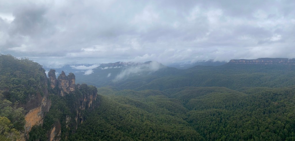 Las Montañas Azules es una región al oeste de Sídney conocida por sus espectaculares paisajes. Acantilados empinados, bosques de eucaliptos, cataratas… Katoomba es una ciudad importante del área, limita con el Parque nacional Montañas Azules y los senderos de excursionismo. Y desde su Echo Point que estaba a 15 minutos de nuestro hotel se tienen vistas de los distintos niveles de la formación de arenisca, Tres Hermanas.