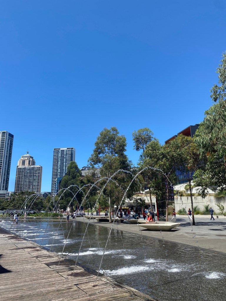 Nos dirigimos a la zona de los Docklands que es un barrio portuario muy moderno, lleno de rascacielos. Es muy popular por las tiendas y los restaurantes que hay junto al río, los espacios públicos y toda la zona peatonal. Seguimos andando y llegamos a South Wharf una zona muy parecida a la anterior con restaurantes, tiendas, zonas peatonales amplias y puentes estrafalarios. Hay que destacar bastantes elementos de diseño contemporáneo realmente muy llamativos.