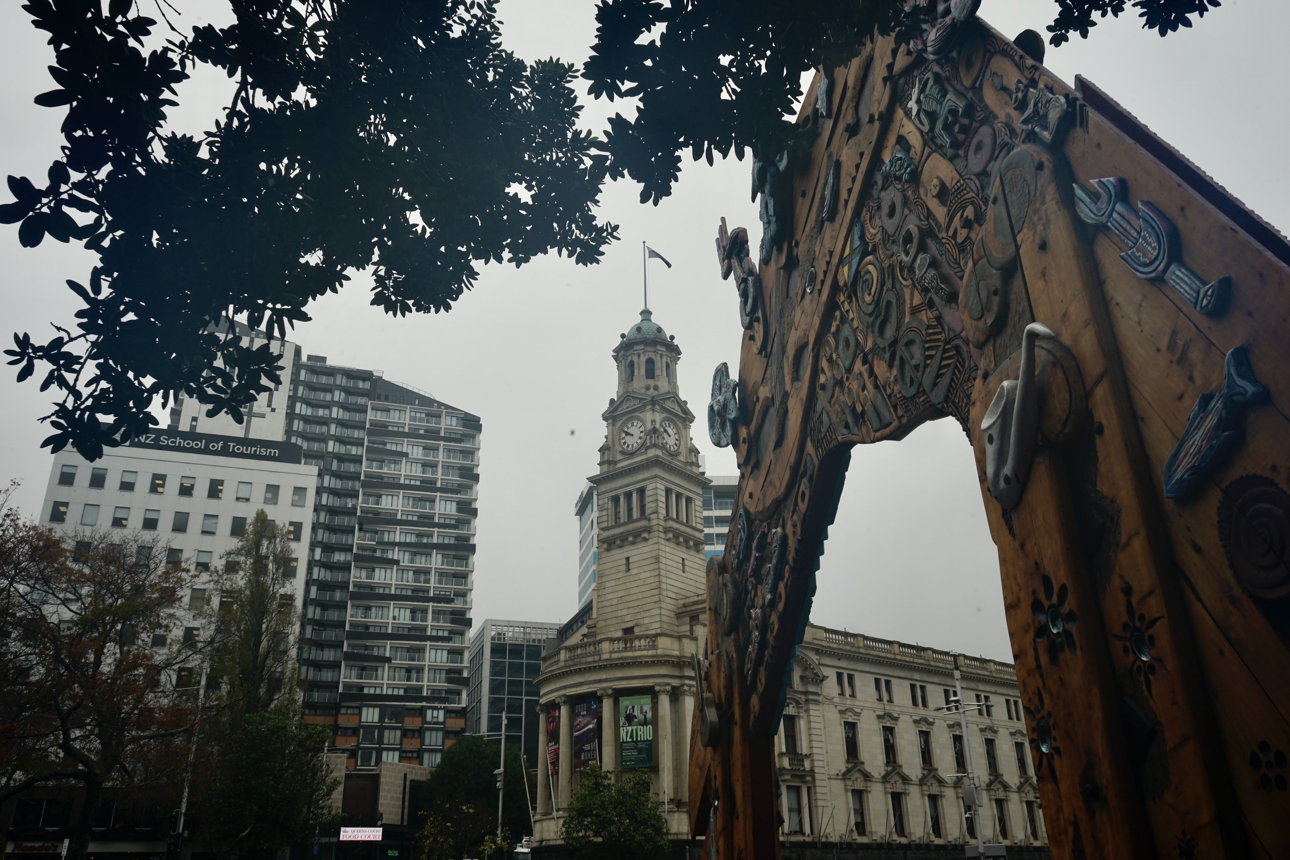 Prosigo mi paseo hasta llegar a Aotea Square que es una gran plaza que se utiliza para conciertos, mercados y actos públicos. En esta plaza se encuentran el ayuntamiento, el cine y el teatro. Además en la entrada de la plaza encontramos un arco llamado «Waharoa» (puerta en maorí) de madera y cobre. Se trata de una versión expresionista de una puerta de entrada tradicional maorí. Presenta símbolos como pájaros, peces, la luna creciente y las estrellas, pero también elementos como el símbolo del desarme nuclear, reflejo de las influencias modernas en el arte neozelandés.