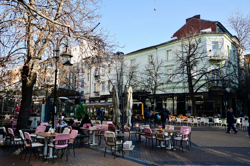 Por la tarde fuimos a pasear por la calle principal Knyaz Alexander I y por un conjunto de callecitas que estaban muy animadas por la tarde-noche: Hristo Dyukmedzhiev, Zagreb y Pavel Kurtevich. Y cómo estábamos cerca, cruzamos la avenida Tsar Boris III Obedinitel para una primera inmersión en el casco antiguo, donde apenas sin gente pudimos disfrutar de sus calles empedradas y bellísimas construcciones de “renacimiento bulgaro”; este estilo, además de muy bello, es muy original (influencias otomanas, rusas, mediterráneas…)